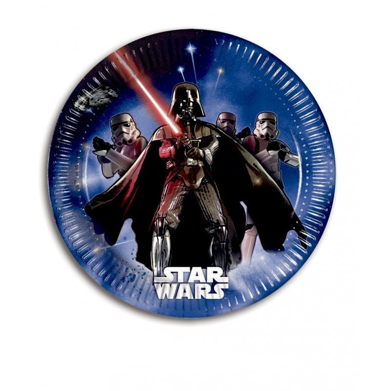 Conjunto de 8 pratos do Star Wars, ideal para decorar a tua festa de aniversário. Com 20cm de diâmetro.