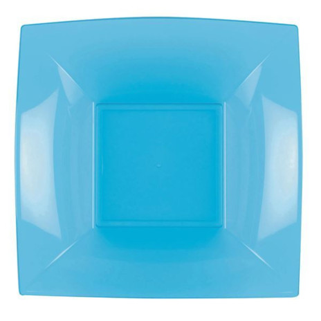 Prato de plástico quadrado na cor azul caribe, robusto e simultaneamente leve, a cor brilhante irá adicionar o toque final a qualquer ocasião especial e podem ser facilmente reuutilizados.