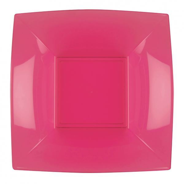 Prato de plástico quadrado na cor rosa fúscia, robusto e simultaneamente leve, a cor brilhante irá adicionar o toque final a qualquer ocasião especial e podem ser facilmente reuutilizados.