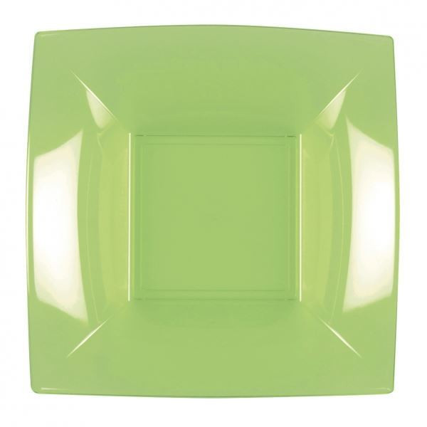 Prato de plástico quadrado na cor verde kiwi, robusto e simultaneamente leve, a cor brilhante irá adicionar o toque final a qualquer ocasião especial e podem ser facilmente reuutilizados.