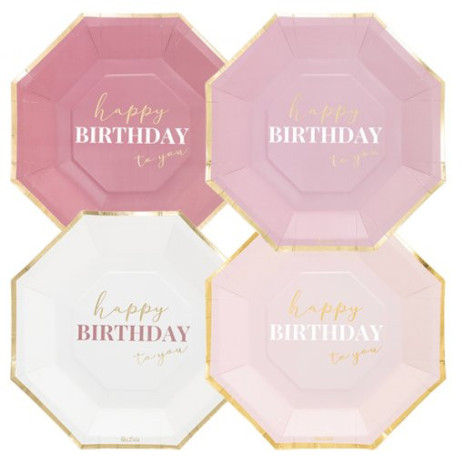 Conjunto de 8 pratos com cores sortidas (cor base rosa) com a inscrição "Happy birthday to you" para decoração da sua festa de aniversário.