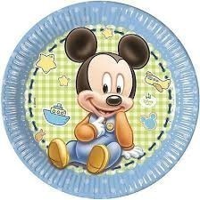 Conjunto de 8 pratos descartáveis em cartão do Mickey Mouse Baby com diâmetro aproximado de 23cm ideais para a decoração da primeira festa de aniversário do seu bebé.
