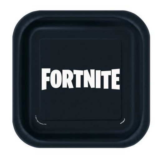 Conjunto de 8 pratos quadrados para festas de aniversário para os fãs do jogo Fortnite. O complemento ideal para a tua festa de aniversário. Pratos em papel, amigos do ambiente.
