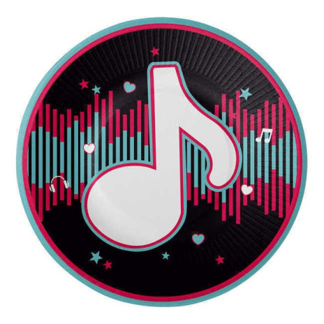 Conjunto de 8 pratos com nota musical do Tik Tok com 18cm para decoração da tua festa com o mesmo tema.