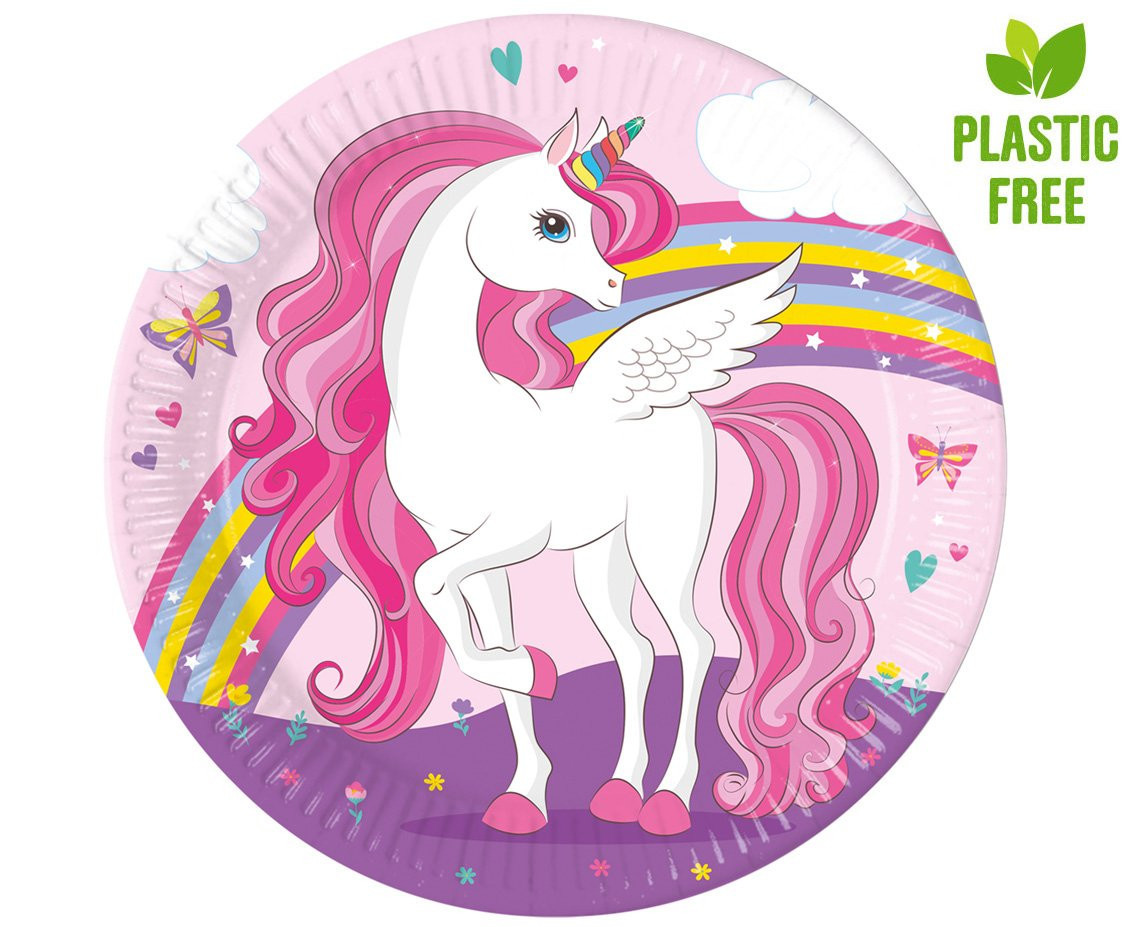 Conjunto de 8 pratos de unicórnio, para decorar a tua festa de aniversário com o mesmo tema.