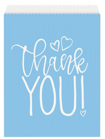 Pack com 8 saquinhos de oferta em azul ideais para colocar brindes ou guloseimas para os convidados do baby shower do seu bebé. Em papel e com as inscrição "Thank You".