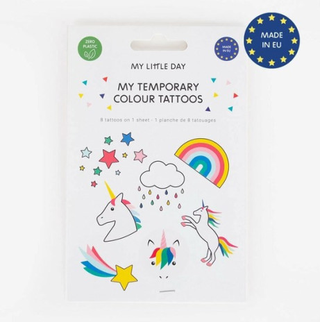 Conjunto de 8 tatuagens de unicórnios, numa única folha. Testado dermatologicamente.