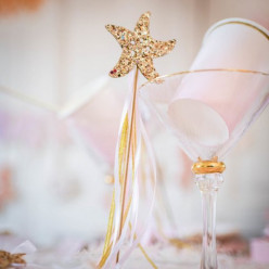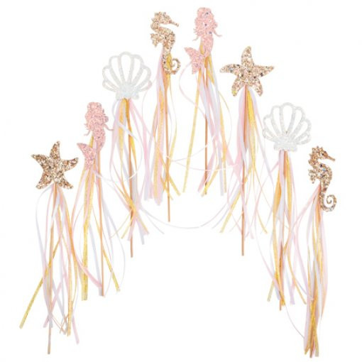 Conjunto de 8 varinhas com fitas para festas de sereias, com estrelas do mar, conchas, cavalos marinhos e sereias com brilhantes.