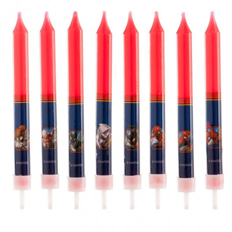 Conjunto de 8 velas em tons de vermelho dos Homem Aranha da Marvel com cerca de 9cm de altura cada.