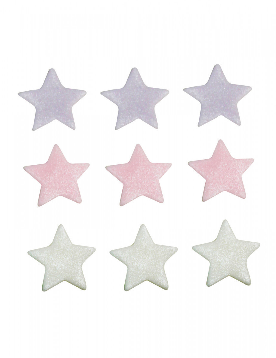 Pack de 9 toppers artesanais feitos em açúcar para decoração de bolos, com motivo de estrelas, nos tons de lilás, rosa e branco