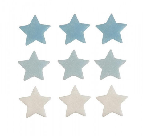PacK de 9 toppers artesanais feitos em açúcar para decoração de bolos, com motivo de estrelas, em dois tons de azul e branco