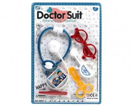 Conjunto de acessórios médicos para menino e para menina em tons de azul. Inclui estetoscópio, caixa medicação, pinça, óculos, medidor e tesoura.