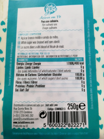 Embalagem de 250gr de açúcar confeiteiro para uso culinário.