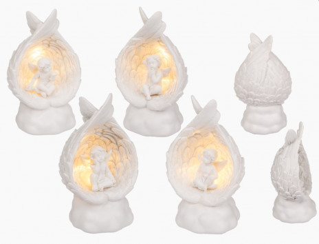 Quatro modelos de anjos sentados nas asas com luz led ideal para decoração de batizados e outros eventos da vida do seu bebé ou da sua criança. Poderá usar como luz de presença fraquinha no quarto da sua criança, será o seu anjo da guarda. Artigo em poliresina.