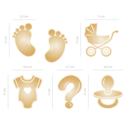Um detalhe encantador para celebrar o seu bebé! Os nossos apliques com elementos de bebé são perfeitos para decorar bolos, cupcakes, lembranças ou centros de mesa em chá de bebé e festas de primeiro aniversário. Com desenhos delicados e amorosos criam uma decoração doce e memorável. São laváveis e reutilizáveis. Fabricados em acrílico com espessura de 3mm. Embalagem com 6 unidades.