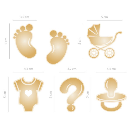 Um detalhe encantador para celebrar o seu bebé! Os nossos apliques com elementos de bebé são perfeitos para decorar bolos, cupcakes, lembranças ou centros de mesa em chá de bebé e festas de primeiro aniversário. Com desenhos delicados e amorosos criam uma decoração doce e memorável. São laváveis e reutilizáveis. Fabricados em acrílico com espessura de 3mm. Embalagem com 6 unidades.