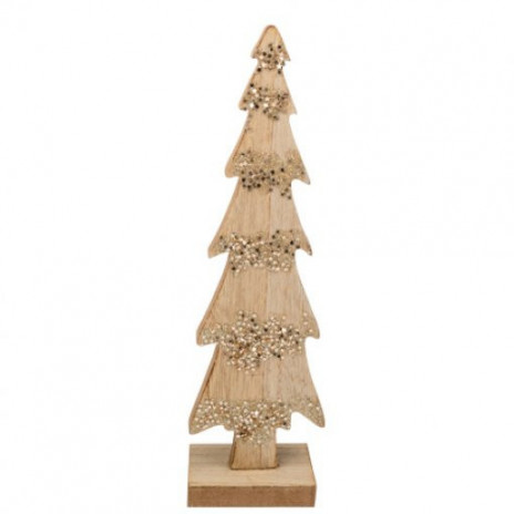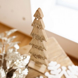 Para decoração de Natal, uma linda árvore de Natal em madeira, rústica, com brilhantes em dourado com cerca de 24cm.