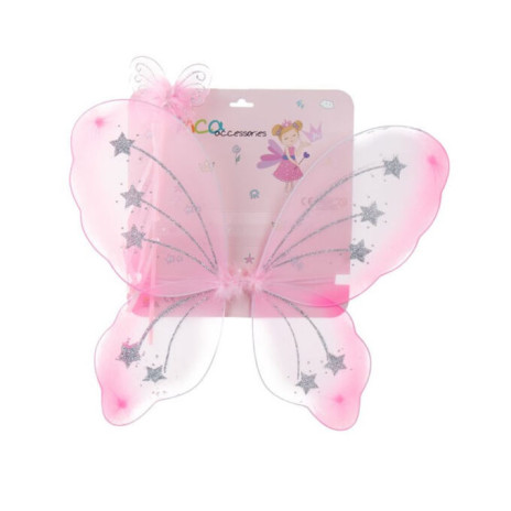 Kit de 2 peças para te mascarares de fada ou princesa com asas. Inclui asas e varinha em tons de cor de rosa.