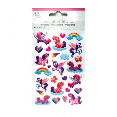 Conjunto de autocolantes com relevo de ponéi com asas para decorares os teus aparelhos eletrónicos, como o pc, o telemóvel, etc, presentes e albuns de fotos. Um brinde ideal para ofereceres aos convidados do teu aniversário.