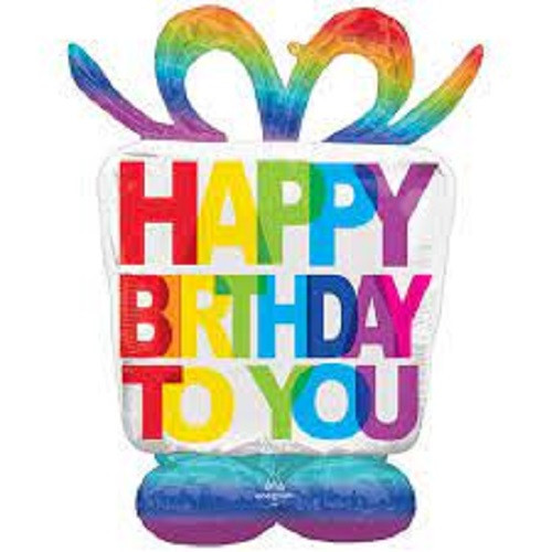 Balão foil (metálico) próprio para encher com ar de presente super colorido com a inscrição "Happy Birthday to You" para decoração de festa. Ideal para decorar qualquer festa devido ao seu tamanho e económico, pois não necessita de hélio.