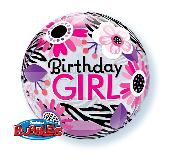 Balão bolha transparente, com a inscrição "Birthday Girl" com várias flores em tons de rosa. Ideal para qualquer festa de aniversário de rapariga.