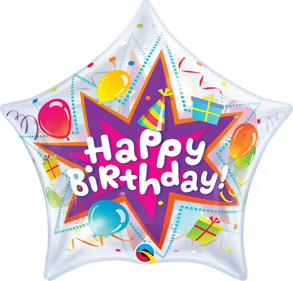 Balão bolha transparente na forma de estrela, com a palavra inscrita "Happy Birthday". Ideal para qualquer festa de aniversário.