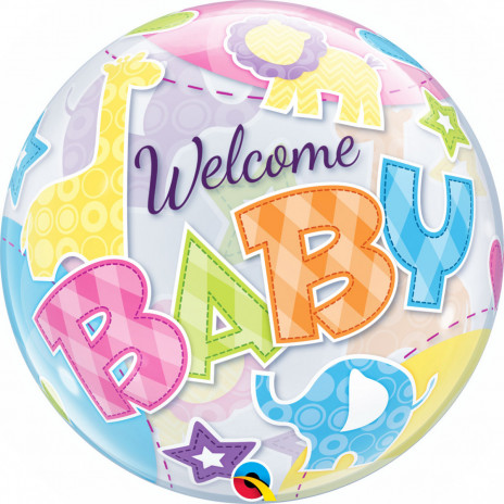 Balão bolha transparente ideal para festas de bebés meninos recém nascidos com a inscrição «Welcome Baby» e padroões de simpáticos animais da selva. Os bubble balloon ficam do tamanho de uma bola de praia depois de cheios e necessitam de um peso de 30gr para não voarem.