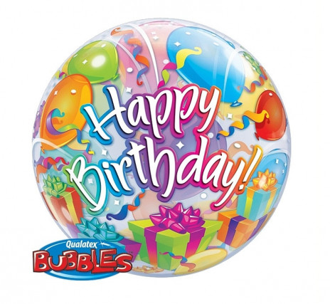Embalagem com balão Bubbles de 22"/56cm, com a inscrição Happy Birthday, para o aniversário com balões e presentes.
