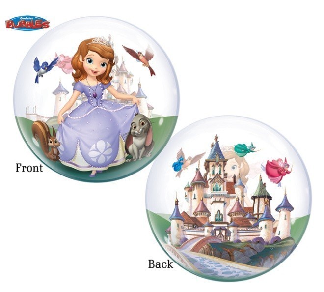 Embalagem com balão Bubbles de 22" /56 cm alusivo ao tema Princesa Sofia da Disney.
