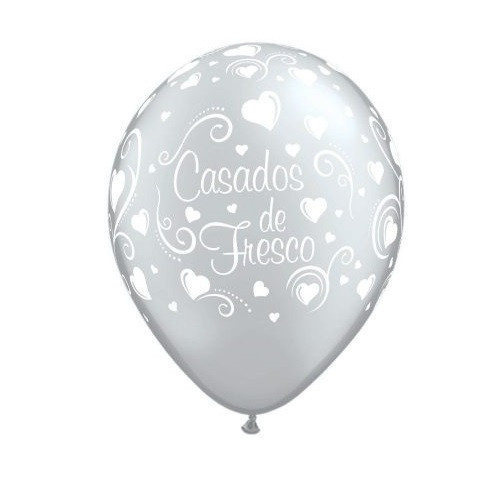 Divertidos balões em prateado em látex de 11", com a impressão Casados de Fresco, para festas de casamento. Qualidade premium e aptos para enchimento com hélio.