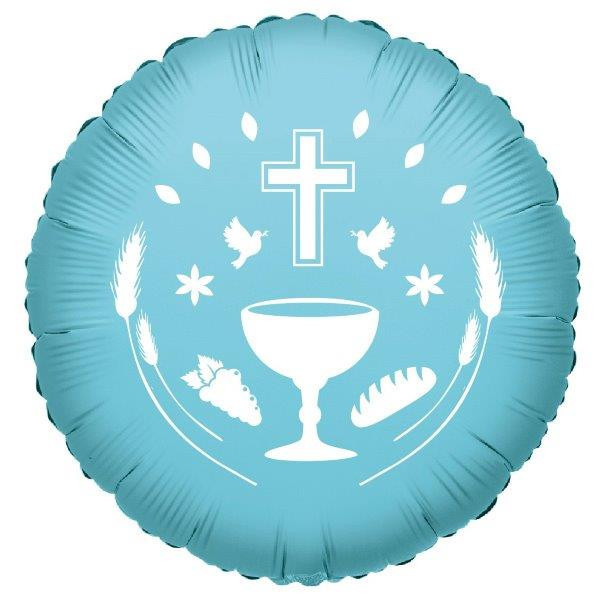Balão redondo em foil e fundo azul com simbolos de Primeira Comunhão para decoração de festa de primeira comunhão.