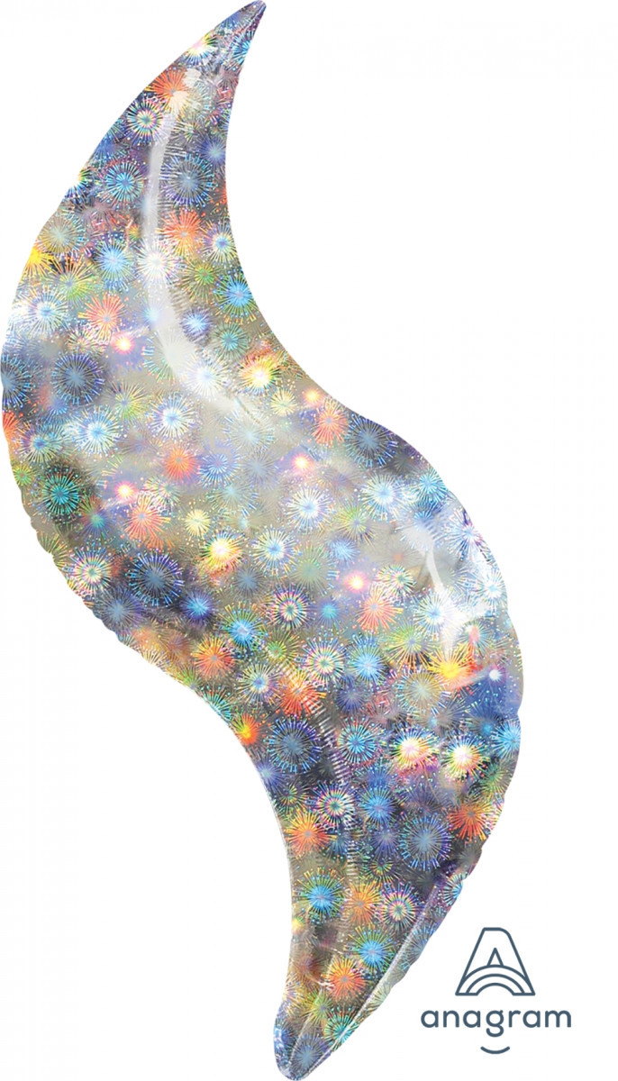 Balão curva ideal para fazer arranjos de caudas de sereias em prateado holográfico com desenhos parecidos com fogo de artifício.