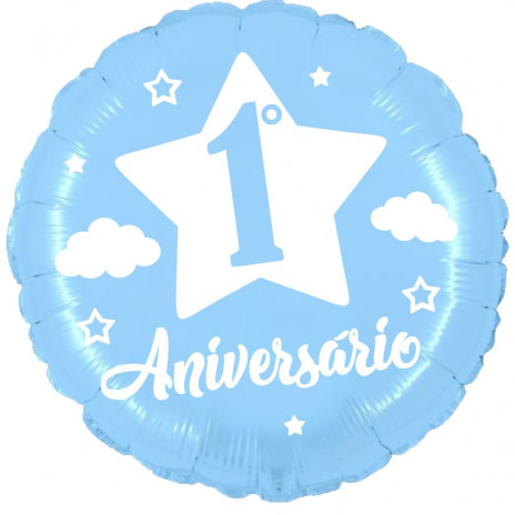 Balão em folha metálica (foil) redondo com a inscrição "1º Aniversário" em azul.