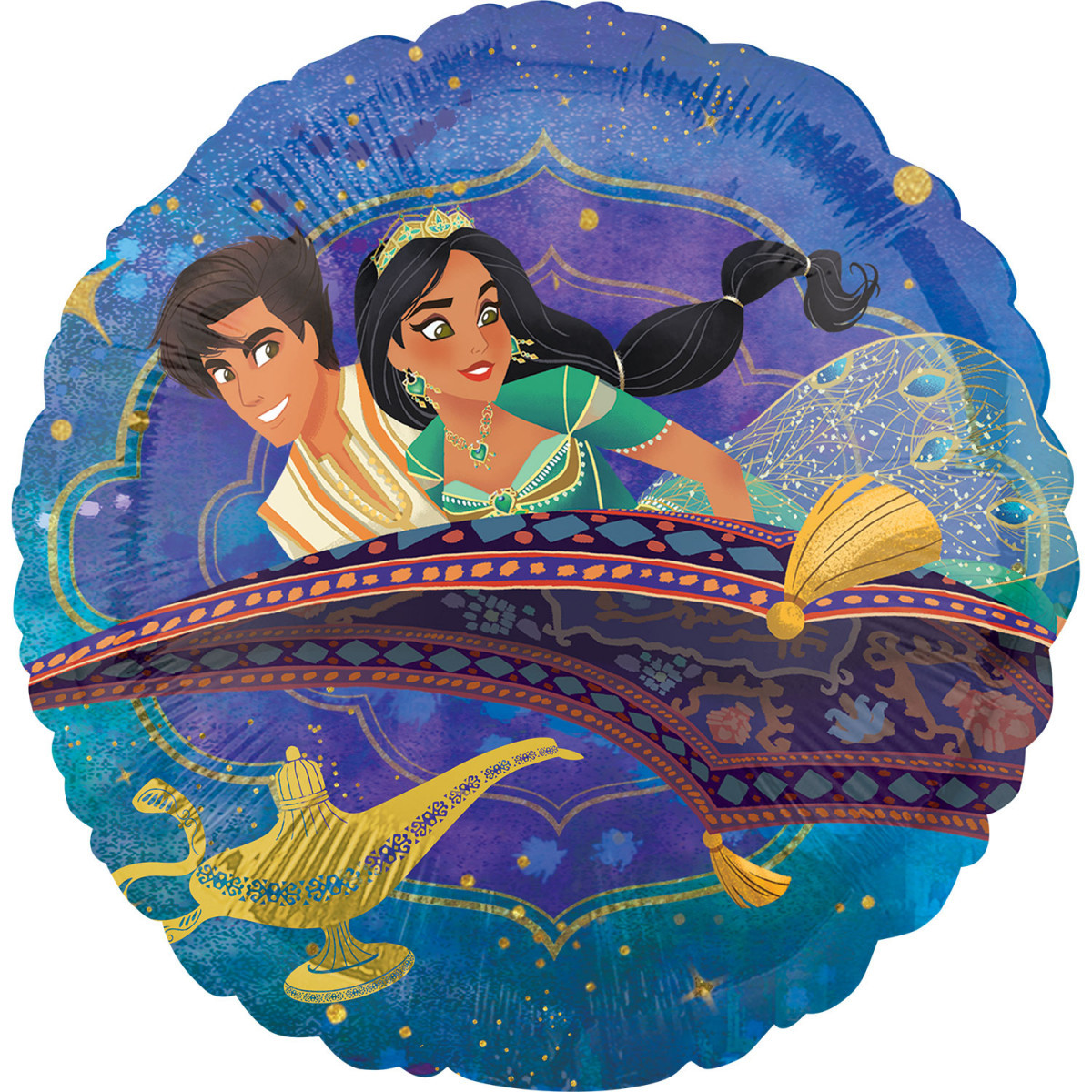 Balão foil redondo do filme Aladino com 43cm. Ideal para decorar a tua festa com o tema do Aladino ou da princesa Jasmine. Com uma imagem diferente de cada lado do balão.