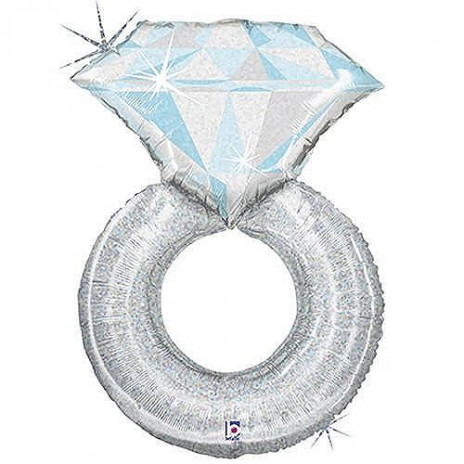 Balão foil com a forma de anel de noivado ou casamento, ideal para decorar a sua festa de dia dos namorados, de casamento ou pedido de namoro/casamento. Tem pormenores holográficos. Pode encher com ar e suspender ou com hélio para flutuar.