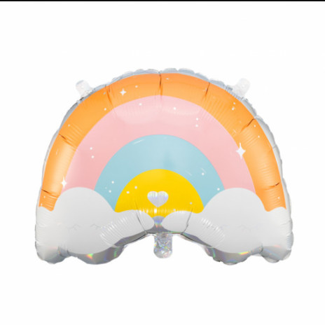 Balão foil (folha de alumínio) com a forma de arco íris em tons pastel, muito bonito, brilhante e colorido para decoração de festa de aniversário, bebé, baby shower.