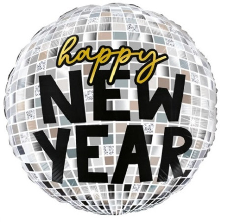 Balão foil com a forma de bola de espelhos com a inscrição "Happy New Year". Ideal para decorar a sua festa de reveillon, ano novo.
