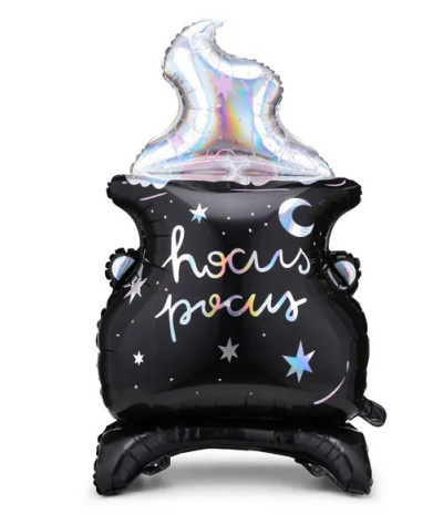 Balão foil (folha de alumínio) com a forma de caldeirão, para o tema de festa de halloween. Inclui palhinha para encher com ar. O balão tem suporte para colocar no chão ou em cima da mesa.