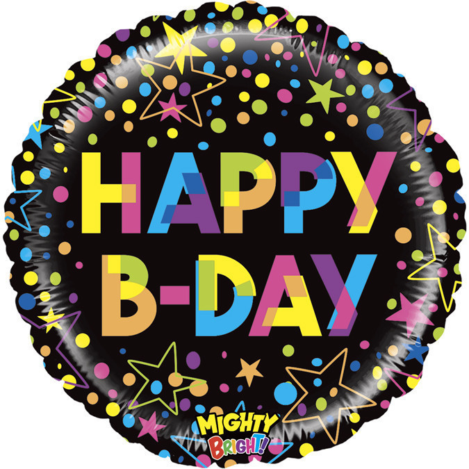 Balão metálico (foil) redondo com a inscrição Happy B-Day, Mighty Bright. Ideal para decorar a sua festa de aniversário.