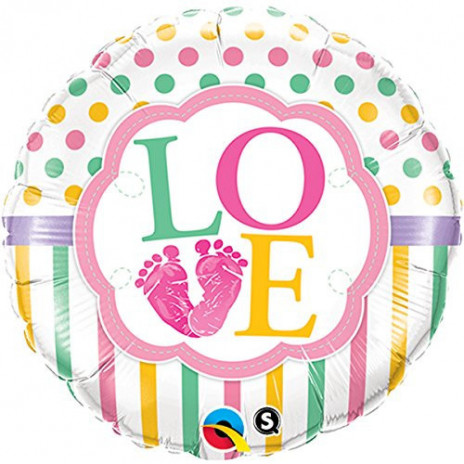 Balão em foil (folha de alumínio) de duas faces, ideal para festas de bebés meninos recém nascidos com a inscrição Baby Girl de um dos lados e do outro com os dizeres Love e pés de bebé.