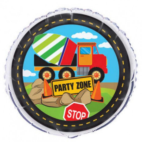 Balão metálico (foil) redondo com a inscrição com veículos e elementos de construção. Ideal para decorar a sua festa de aniversário.