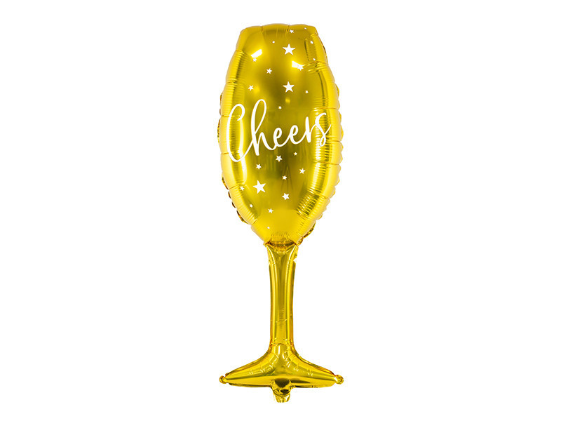 Balão foil (em folha de alumínio) em forma de copo de espumante de cor dourada com a inscrição "Cheers", ideal para a comemoração do Ano Novo.