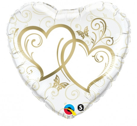 Balão foil (em folha de alumínio) em forma de coração com dois corações e duas borboletas estampadas, ideal para casamentos e aniversários dos mesmos.