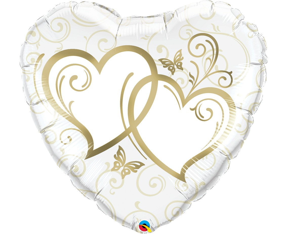 Balão foil (em folha de alumínio) em forma de coração com dois corações e duas borboletas estampadas, ideal para casamentos e aniversários dos mesmos.