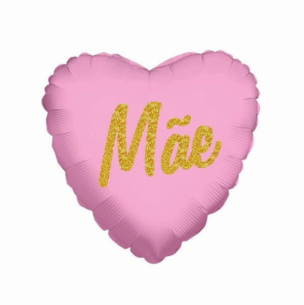 Balão para festejar o dia da mãe em foil com o formato de coração em cor de rosa com a palavra mãe em dourado com glitter.