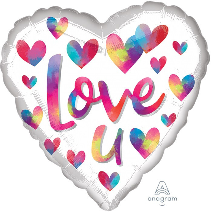 Balão em forma de coração em branco com corações coloridos com a inscrição "Love U", em foil. Para surpreender a sua cara metade no dia dos namorados, no dia de são valentim.