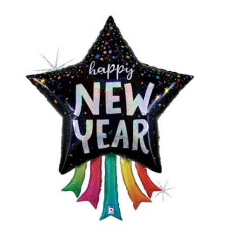 Balão foil com a forma de estrela com fitas com a inscrição "Happy New Year" com pormenor glitter holográfico. Ideal para decorar a sua festa de reveillon, ano novo.