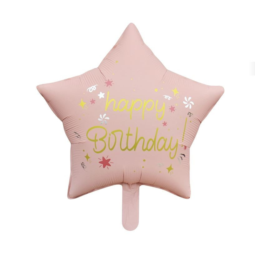 Balão foil estrela com a inscrição "Happy Birthday" rosa pastel, ideal para qualquer festa de aniversário.