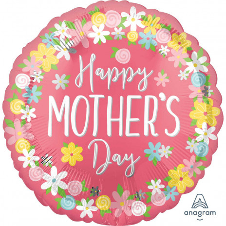 Balão foil do Dia da Mãe em rosa com motivos florais com cerca de 71cm de diâmetro.