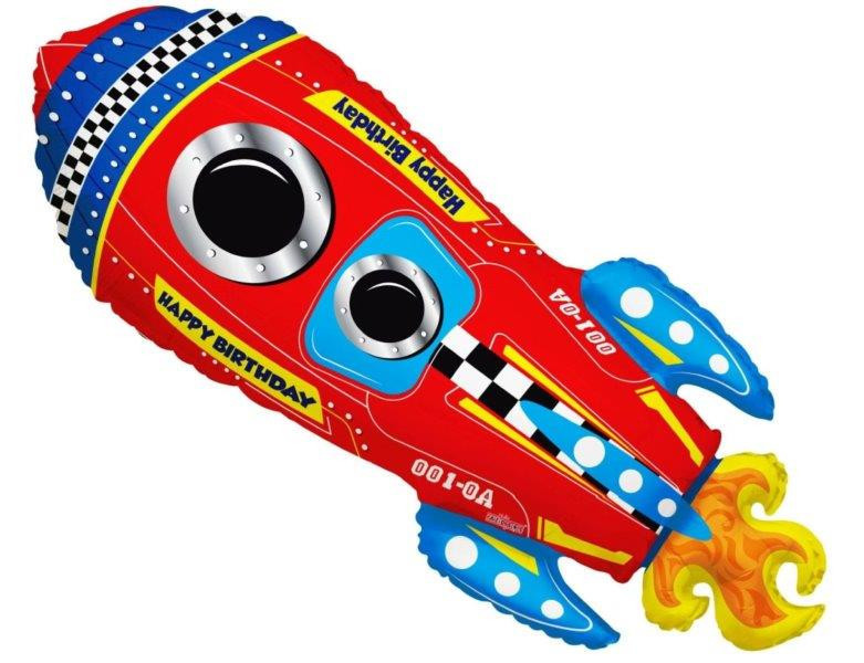 Belíssimo e colorido balão metálico (foil) de foguetão, para animar ainda mais a tua festa de aniversário com o tema do espaço com a inscrição "Happy Birthday"